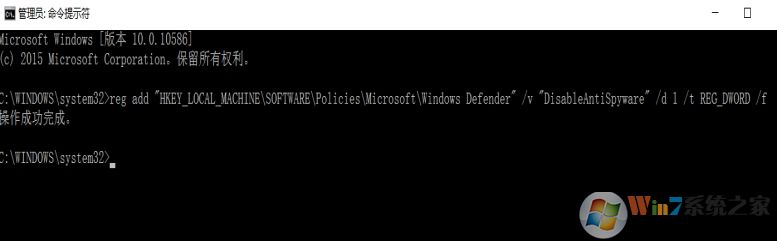 輸入命令:reg add "HKEY_LOCAL_MACHINE\SOFTWARE\Policies\Microsoft\Windows Defender" /v "DisableAntiSpyware" /d 1 /t REG_DWORD /f