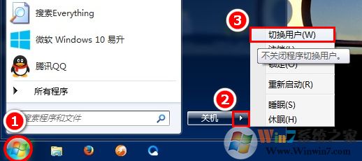 1、點擊“開始”按鈕,點擊“關機”按鈕右側的箭頭,選擇“切換用戶”;
