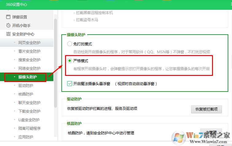 2、打開360查看攝像頭保護(hù)模式是哪一種,選擇為嚴(yán)格模式,這樣每次提醒是否允許使用攝像頭我們點(diǎn)擊允許即可。