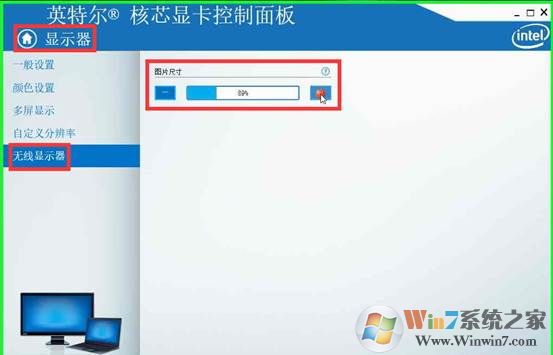 圖形屬性-顯示器-無線顯示器-調(diào)節(jié)縮放即可,測試顯示最小85%。