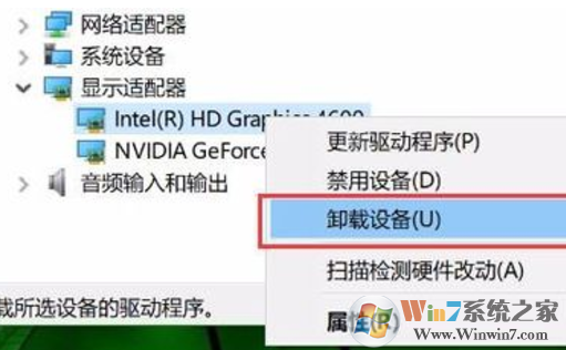 2、打開“顯示適配器”,找到集成顯卡,點擊鼠標右鍵,選擇卸載;