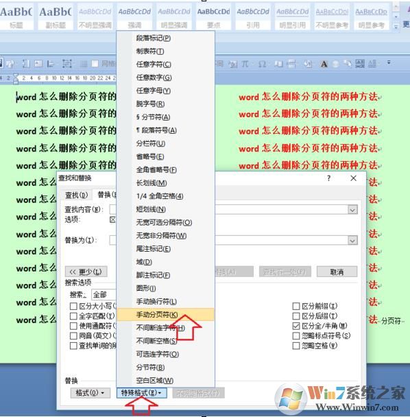 2.單擊“特殊格式”按鈕,單擊“手動(dòng)分頁符”命令,如下圖: