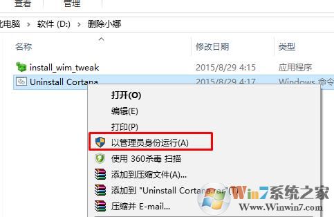 3、右鍵點(diǎn)擊Uninstall Cortana.cmd 以管理員身份運(yùn)行!