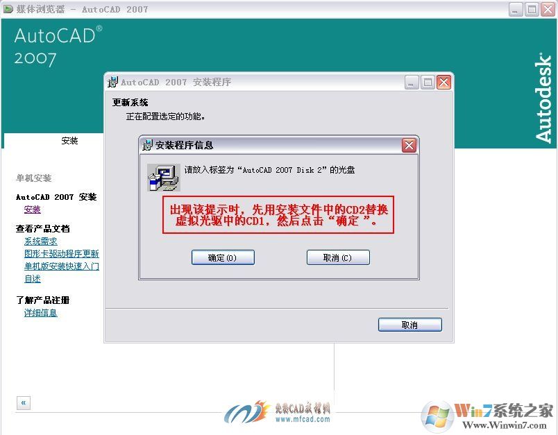 第十一步:安裝過程中,如果彈出更換安裝光盤提示,則需把CD2放入虛擬光驅(qū),然后再點(diǎn)擊“確定”。