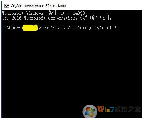 2、在命令提示符中輸入:icacls c:\ /setintegritylevel M 按回車鍵后等1分鐘,會出現(xiàn)“已成功處理一個文件”;