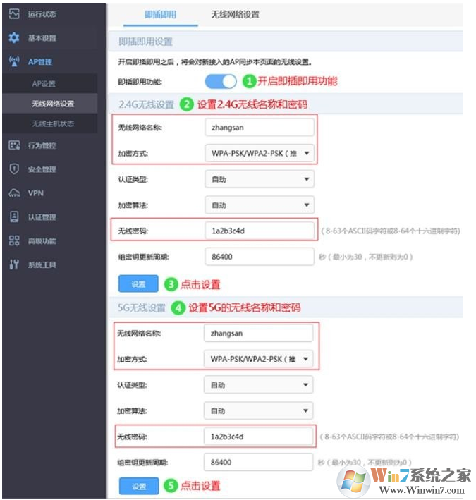 3、點擊“AP管理>無線網(wǎng)絡設置>即插即用”,分別設置2.4G和5G的無線名稱和無線密碼,如圖: