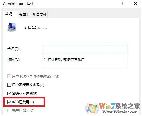 4、在Administrator屬性框中,將“賬戶已禁用”的勾去掉,點擊【確定】;