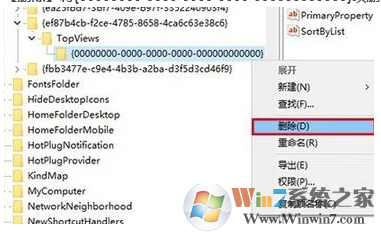 3、展開TopViews 后,將下面的{00000000-0000-0000-0000-000000000000}單擊右www.w10zj.com鍵,選擇 【刪除】將{00000000-0000-0000-0000-000000000000}項(xiàng)刪除;