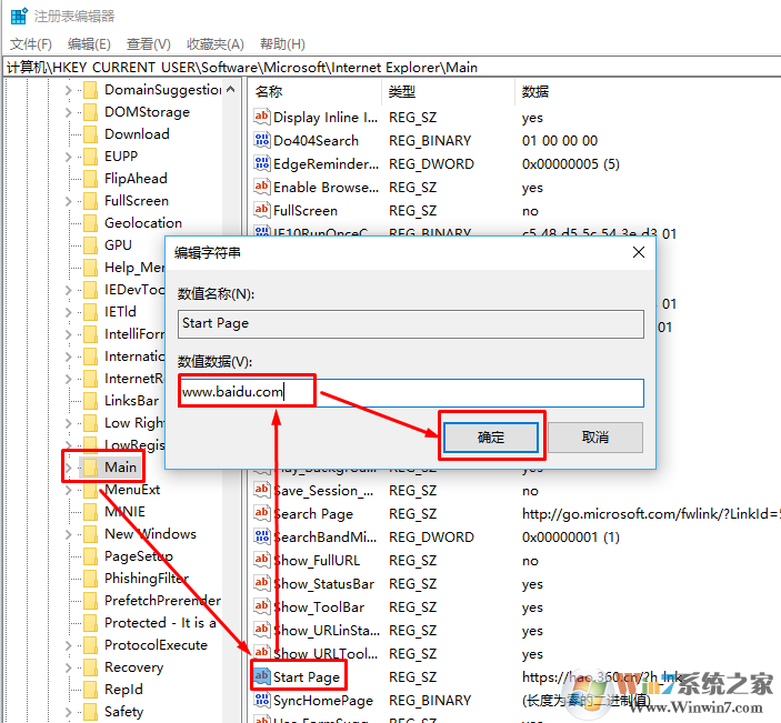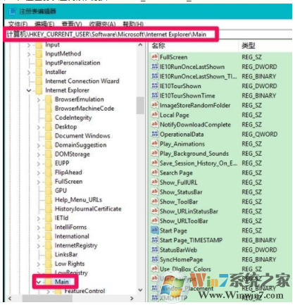 2、在注冊(cè)表左側(cè)依次展開:HKEY_CURRENT_USER\Software\Microsoft\Internet Explorer\Main ;