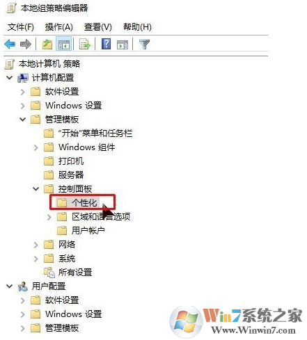 2、在左側(cè)依次展開:計算機配置 -- 管理模版 -- 控制面板 -- 個性化 ;