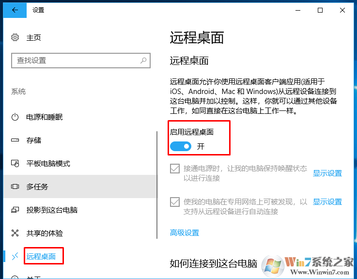 3、選擇遠程桌面。將啟用遠程桌面打開。