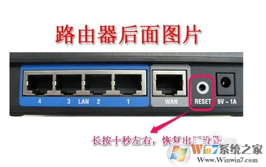 如果你確認路由器連接沒有問題,我們現(xiàn)在可以恢復路由器的出廠設置!在路由器后面有一個reset重置鍵,我們按住這個鍵不要放10秒鐘左右,等路由器指示燈全亮后即可!當然不同的路由器恢復時間可能不同,具體你可以看你路由器的說明書。這樣我們給路由器恢復了默認設置!