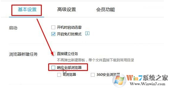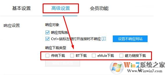 3、切換到【高級(jí)設(shè)置】選卡下,找到【響應(yīng)下載類(lèi)型】,將下面的【傳統(tǒng)下載】、【BT下載】、【eMule下載】、【磁力鏈接下載】的勾全部去掉,關(guān)閉迅雷即可。