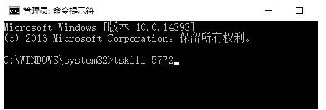 3、然后在命令提示符中輸入:tskill PID號 ,如小編想要結(jié)束pid號為5772的進(jìn)程直接輸入:tskill 5772 按下回車鍵即可