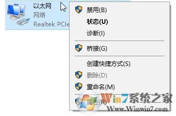 2、在以太網(wǎng)上單擊鼠標右鍵,選擇【屬性】(這里不是唯一的,如果當前使用無線的話則在“WLAN”上進行操作);