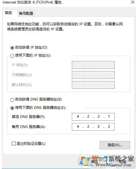 4、點擊【使用下面的DNS 服務(wù)器地址】,輸入:4 2 2 1 / 4 2 2 2 如圖: 點擊【確定】即可。