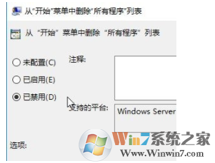 3、在右側(cè)雙擊打開(kāi)【從開(kāi)始菜單中刪除所有程序列表】,—右鍵—編輯—設(shè)置為“已禁用”-“確定”即可。設(shè)置完成后,重新打開(kāi)開(kāi)始菜單,你會(huì)發(fā)現(xiàn),所有程序選項(xiàng)回來(lái)了。