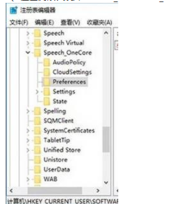 2、在左側(cè)依次展開:HKEY_CURRENT_USER\SOFTWARE\Microsoft\Speech_OneCore\Preferences ;