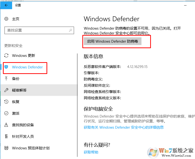 2、設(shè)置---更新和安全---點(diǎn)擊啟用windows defender。