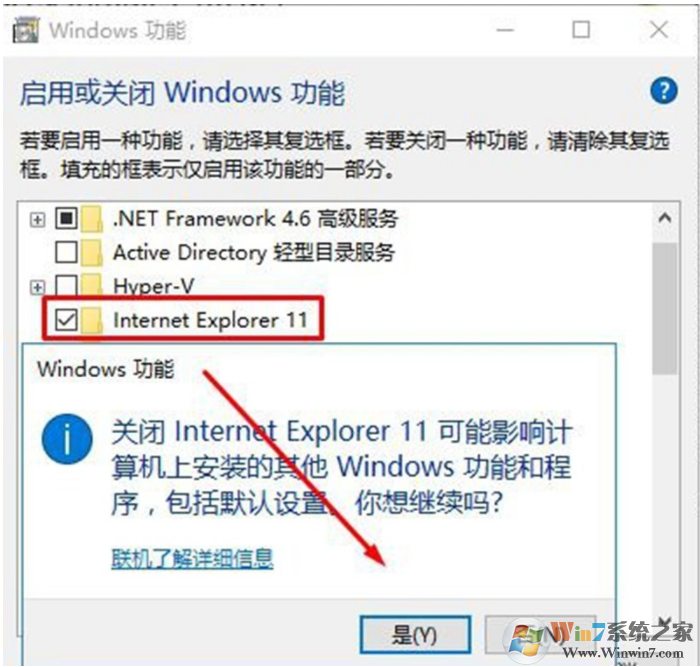3、將【internet Explorer 11】的勾去掉,在彈出的提示框中點擊【確定】- 【確定】,耐心等待后系統(tǒng)便會將ie卸載;