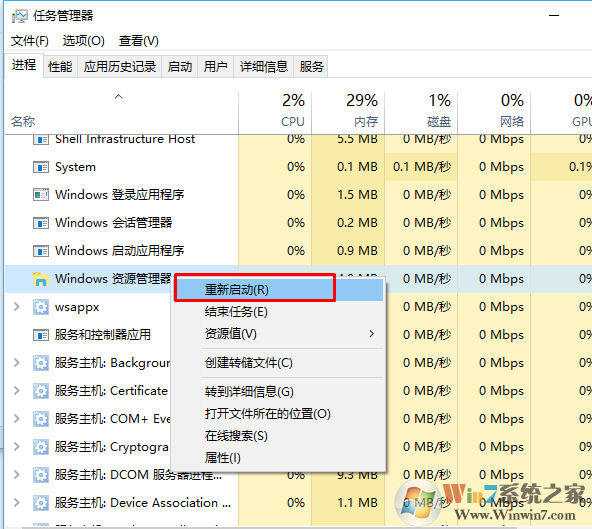 2、在進(jìn)程中找到【W(wǎng)indows 資源管理器】 單擊右鍵,選擇【重新啟動】。