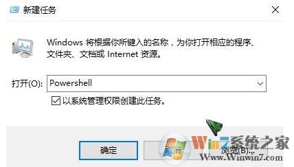 2、勾選“使用管理員身份創(chuàng)建這個任務(wù)”,輸入”Powershell" 點擊確定;