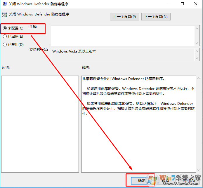 3、雙擊關閉Windows Defender,選擇未配置即可。