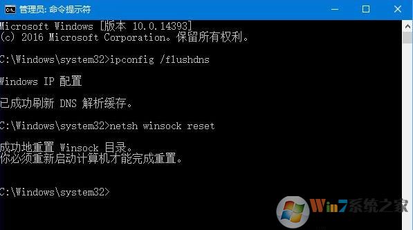 3、重置winsock 目錄設(shè)置后等待提示已成功刷新DNS 解析緩存,繼續(xù)輸入:netsh winsock reset 命令按下回車鍵執(zhí)行命令,如下圖所示: