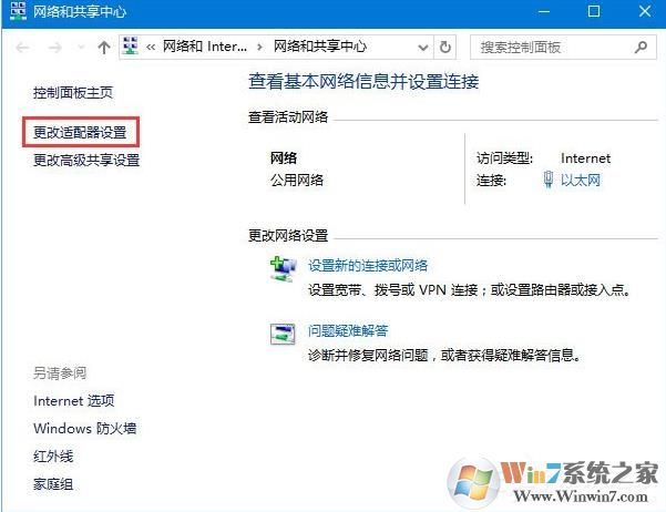 2、左上側(cè)找到點擊【更改適配器設(shè)置】 ,如圖:
