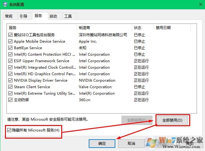 3、標(biāo)記隱藏所有Microsoft服務(wù)框并選擇全部禁用。