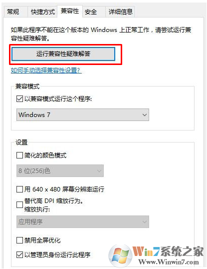 3、如果疑難解答不能解決此問(wèn)題,那么我們可以執(zhí)行以下操作。在屬性窗口切換到【兼容性】選卡,在下面勾選 兼容模式,在以兼容模式運(yùn)行這個(gè)程序下拉菜單選擇【windows 7】并在下面勾選【以管理員身份運(yùn)行此程序】,點(diǎn)擊確定保存設(shè)置即可!