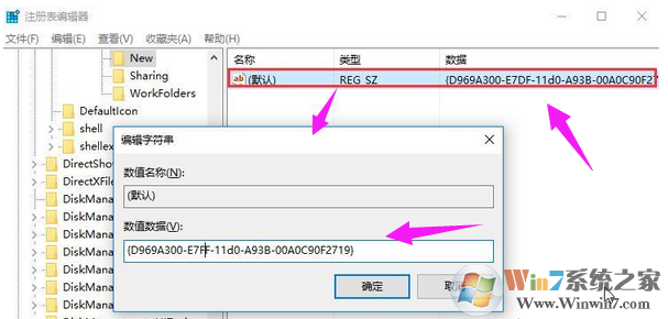 4、在New對應(yīng)的右側(cè)窗口,(默認(rèn))的值是:{D969A300-E7FF-11d0-A93B-00A0C90F2719},如果不是,則左鍵雙擊:(默認(rèn)),在彈出的編輯字符串的對話框中,把數(shù)值數(shù)據(jù)更改為:{D969A300-E7FF-11d0-A93B-00A0C90F2719},再點(diǎn)擊:確定
