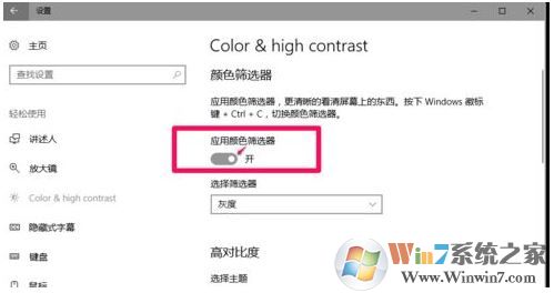 4、此時會打開Color & high contrast(彩色高對比度)窗口,我們可以看到“應(yīng)用顏色篩選器”的開關(guān)處于【開】的位置,如下圖所示: