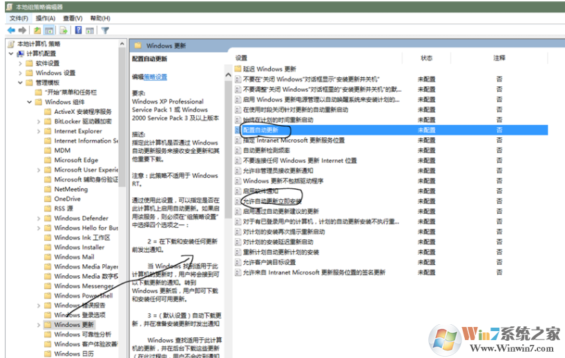 3、再Windows更新中找到配置自動更新和允許自動更新繼續(xù)安裝選項,全部選擇為禁用即可。