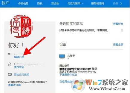 步驟三、在微軟網(wǎng)站賬戶頁面,點(diǎn)擊“編輯名字”如圖: