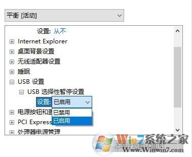 第五步、在高級(jí)設(shè)置對(duì)話框,在項(xiàng)目列表中點(diǎn)開(kāi)“USB選擇性暫停設(shè)置”,然后點(diǎn)擊后面的向下箭頭,里面有兩個(gè)選項(xiàng):1、已禁用;2、已啟用,我們可以根據(jù)個(gè)人實(shí)際情況選擇設(shè)定方式后,點(diǎn)擊底部的“確定”即可,如下圖所示: