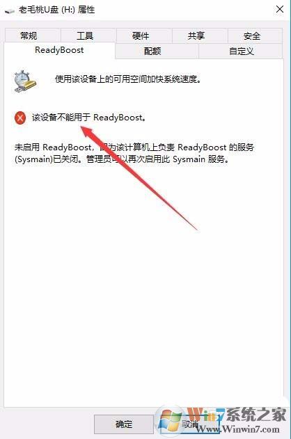 1、在使用U盤啟用ReadyBoost服務(wù)的時(shí)候,提示“該設(shè)備不能用于ReadyBoost”,我們點(diǎn)擊確定按鈕。