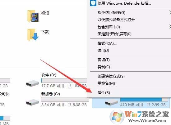 7、我們再右鍵點(diǎn)擊U盤,然后在彈出菜單中點(diǎn)擊“屬性”菜單項(xiàng)
