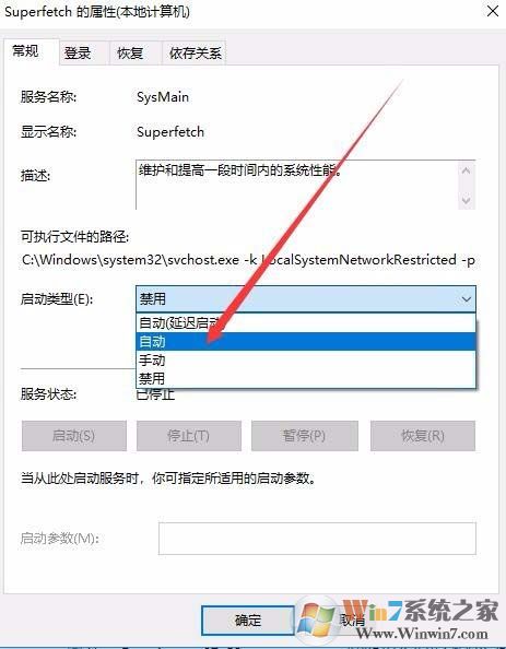 5、在打開的屬性窗口中點(diǎn)擊啟動類型下拉菜單,在彈出菜單中選擇“自動”菜單項(xiàng)