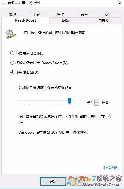 8、在打開的U盤屬性窗口中,點(diǎn)擊ReadyBoost標(biāo)簽,現(xiàn)在可以看到ReadyBoost可以啟用了。