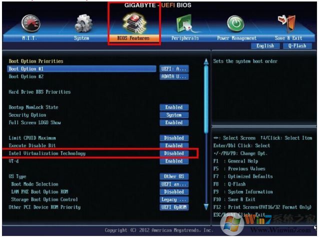 1、在里面有一項(xiàng)——Intel Virtualization Technology (Intel虛擬化技術(shù)),把它設(shè)置為:Enabled(啟用),然后保存就可以了。