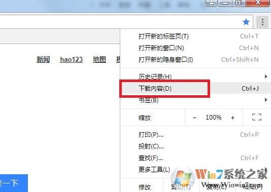 2、打開谷歌瀏覽器后點擊右上角的三個點的圖標(biāo)打開菜單,選擇“下載內(nèi)容”;