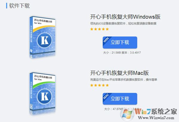 【一】:下載開(kāi)心手機(jī)恢復(fù)大師。開(kāi)心手機(jī)恢復(fù)大師有兩個(gè)版本:Windows版本和Mac版本。下載的時(shí)候,根據(jù)自己的電腦系統(tǒng)來(lái)下載相應(yīng)的版本。一般大家都會(huì)用Windows版