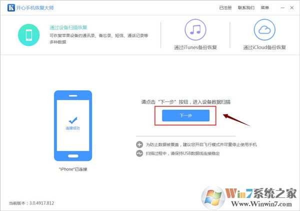 【二】:安裝打開(kāi)軟件,因?yàn)樵S多情況下刪除微信聊天記錄,是沒(méi)有備份的,所以我們選擇“通過(guò)設(shè)備掃描恢復(fù)”這個(gè)模式來(lái)恢復(fù)。這個(gè)模式不需要備份。在恢復(fù)刪除的微信聊天記錄之前,先把蘋(píng)果手機(jī)用數(shù)據(jù)線(xiàn)連接電腦。連接后,等待軟件讀取手機(jī),識(shí)別手機(jī)后顯示設(shè)備信息,然后點(diǎn)擊“下一步”。