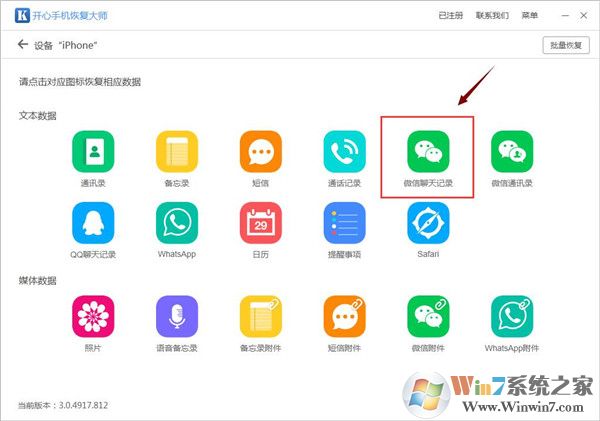 【三】:然后會(huì)跳轉(zhuǎn)到恢復(fù)主界面。主界面顯示的圖標(biāo)包括:微信聊天記錄、短信、通訊錄、照片、備忘錄等共計(jì)17種。我們點(diǎn)擊“微信聊天記錄圖標(biāo)”,然后軟件開(kāi)始掃描蘋(píng)果手機(jī)中的微信聊天記錄。