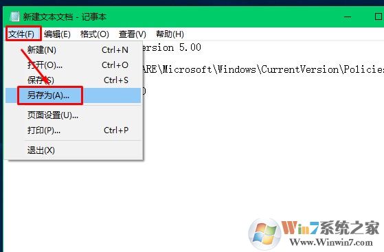 2、在記事本中點擊“文件”-“另存為”,將【保存類型】修改為 所有文件,將其保存到桌面,并將文件名修改為 winwin7.reg (后綴必須是.reg,文件名可以隨意修改),點擊 保存 ;