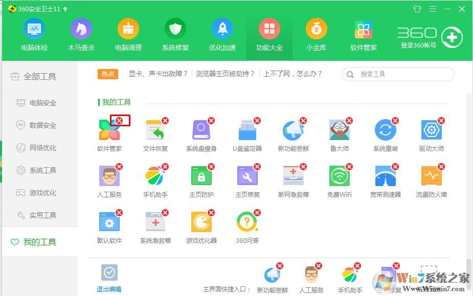3、這時(shí)我的工具中,軟件管家會出現(xiàn)一個(gè)“叉號”,我們點(diǎn)擊刪除360軟件管家;