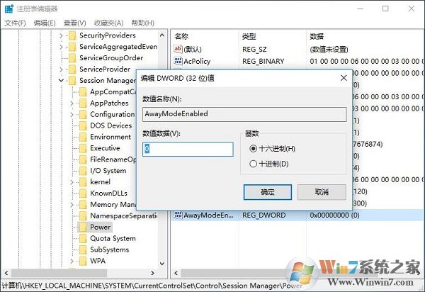 3、點(diǎn)擊Power 后在右側(cè)雙擊打開“AwayModeEnabled”值,然后將其數(shù)值數(shù)據(jù)修改為 0 點(diǎn)擊確定保存,若沒有該值則右側(cè)單擊右鍵新建一個(gè)"DWORD 32位"值, 命名為"AwayModeEnabled" 修改為上述 數(shù)值即可;