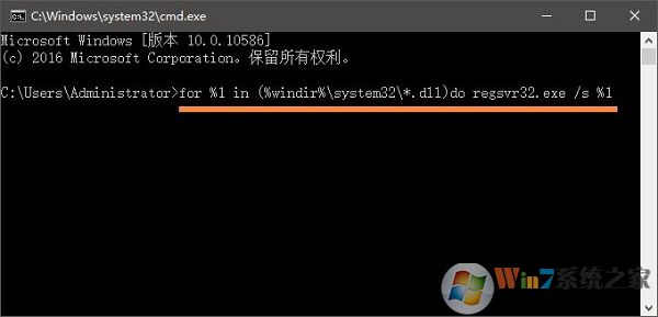 2、在命令提示符中輸入:for %1 in (%windir%\system32\*.dll)do regsvr32.exe /s %1 按下回車鍵;如圖所示: