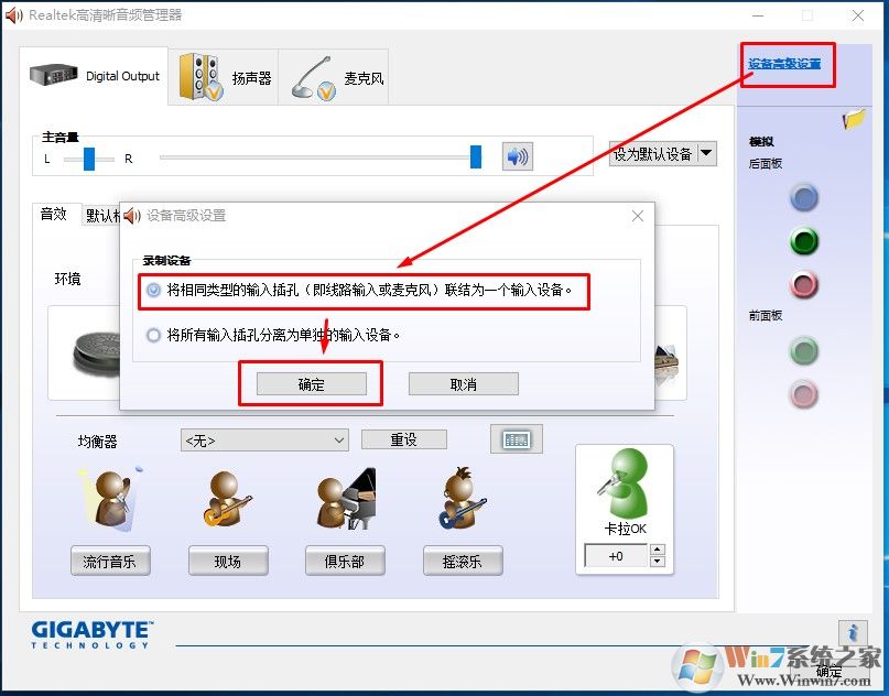 2、打開高級設(shè)置,將相同類型的輸入插孔歸類為同一設(shè)備勾選,這樣在插入耳機的情況下就會優(yōu)先播放耳機了。